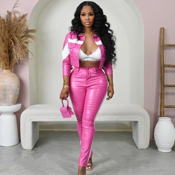パンツ レディース 秋冬 配色 長袖 襟付き レザー風 セットアップ ツーピース ハイウエスト 美脚 ロングパンツ スタイルアップ ブラック ピンク系